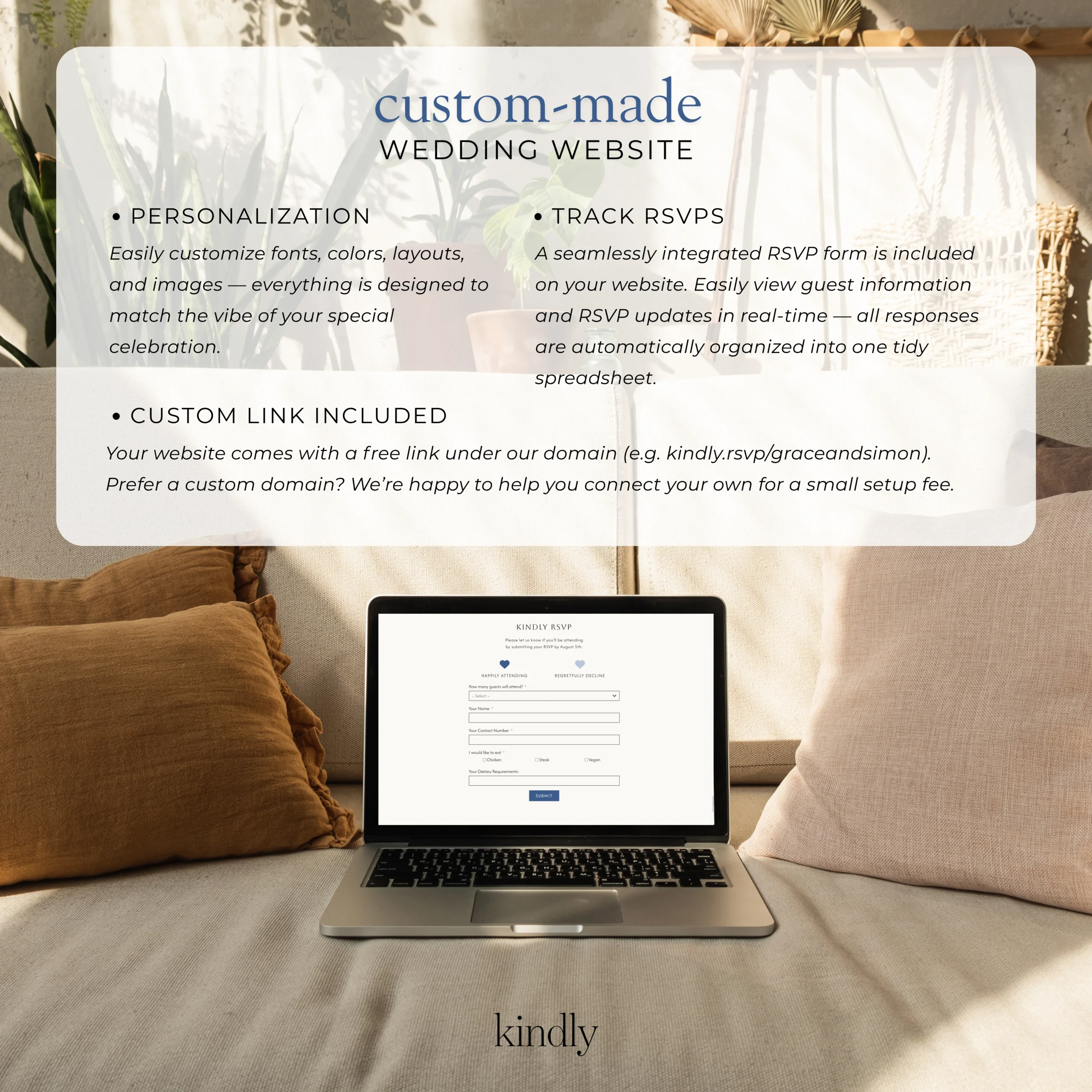 Create a beautifully styled, made-for-you wedding website with an integrated RSVP form — no editing required!